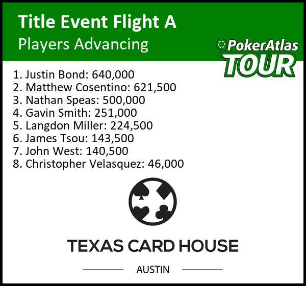 The PokerAtlas Title Event is officially underway! Flight A registration is now closed, and 9 players remain from the starting field. 8 will move onto Day 2 from the initial 64 players.