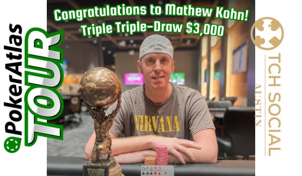 Congratulations to Matt Kohn on winning the PokerAtlas Tour’s Event 7: $300 Triple Triple Draw! After a heads up battle with Rob Paape, Kohn outlasted a field of 41 entries to take down $3,000 and 30 points for first place!